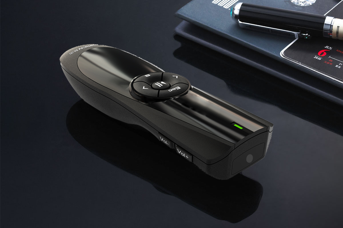 激光、播放、停止、向上翻页,向下翻页、黑屏、退出、调节音量,ON/OFF开关。文档演示方便、高效。