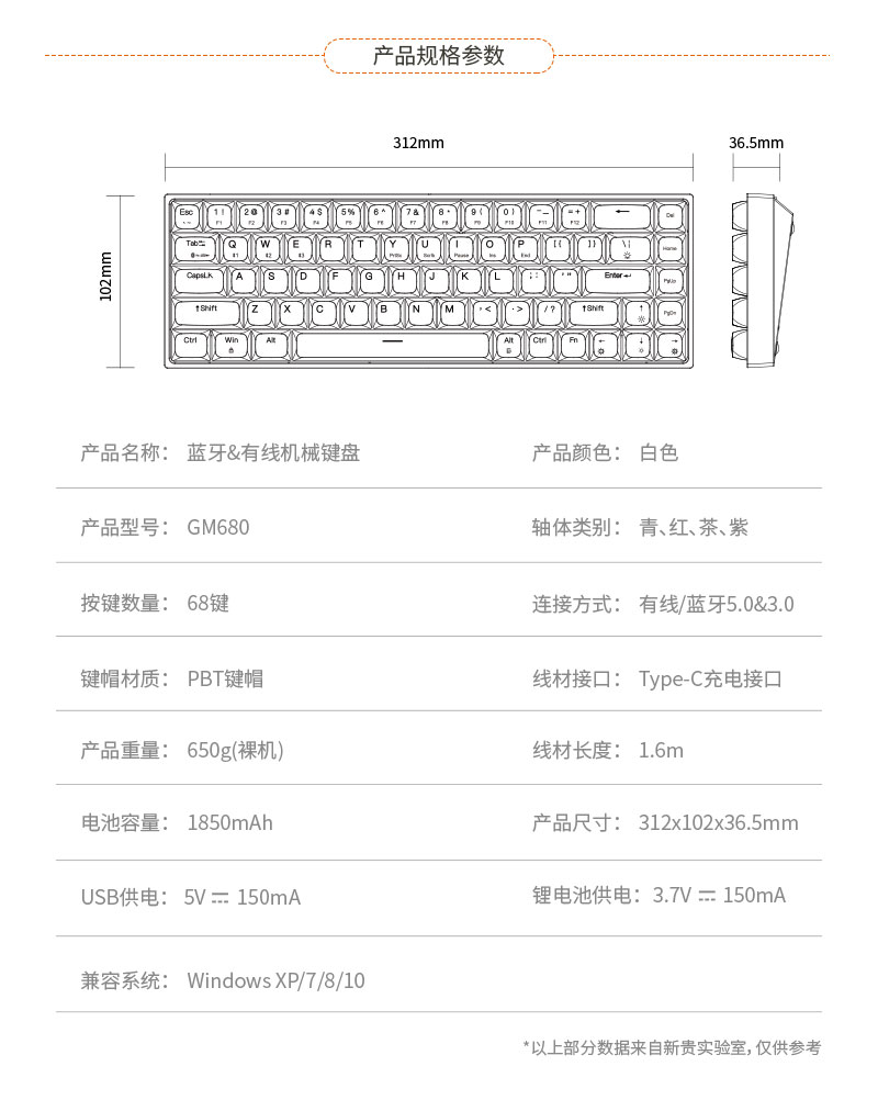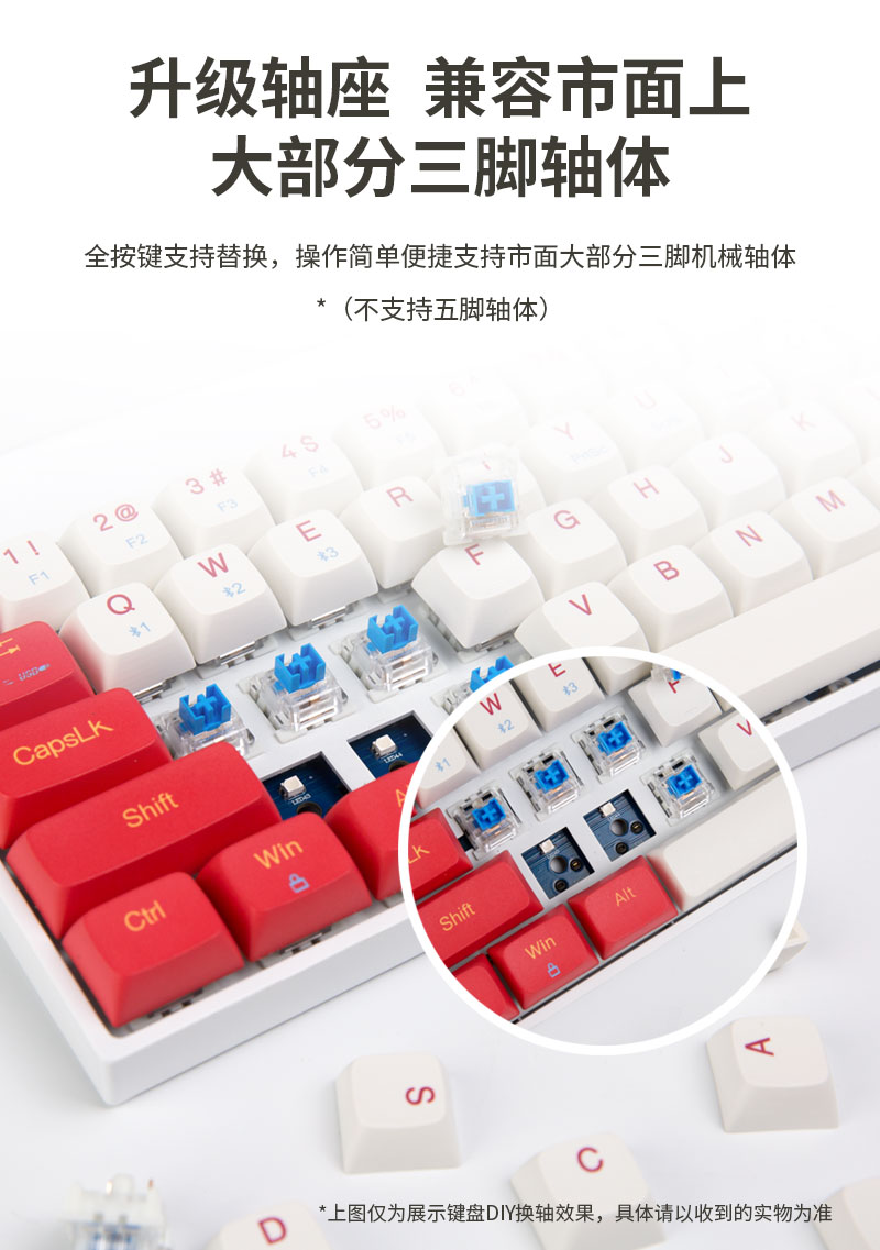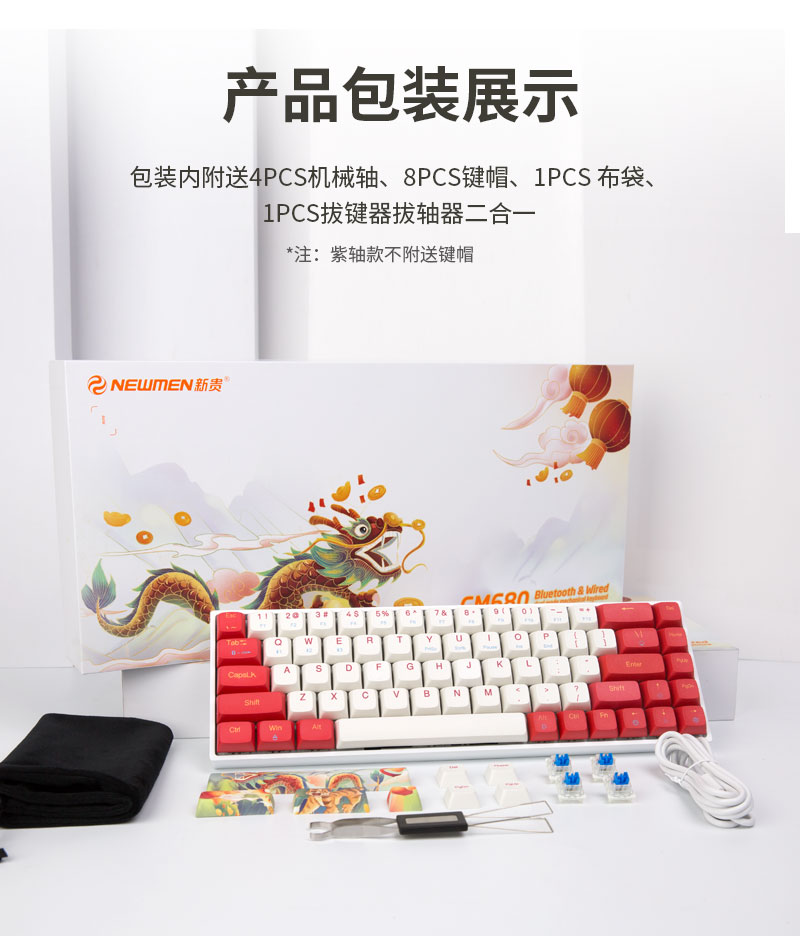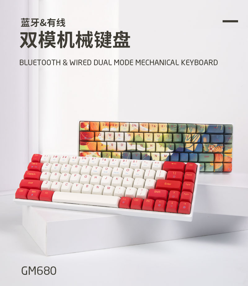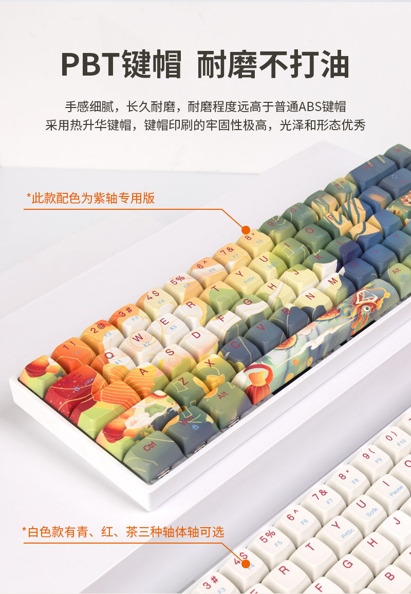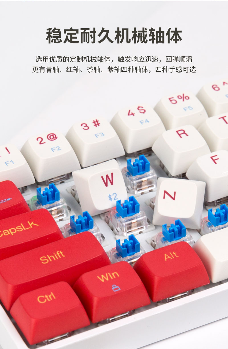 蓝牙有线双模机械键盘,青、红、茶、紫四种轴体可选。