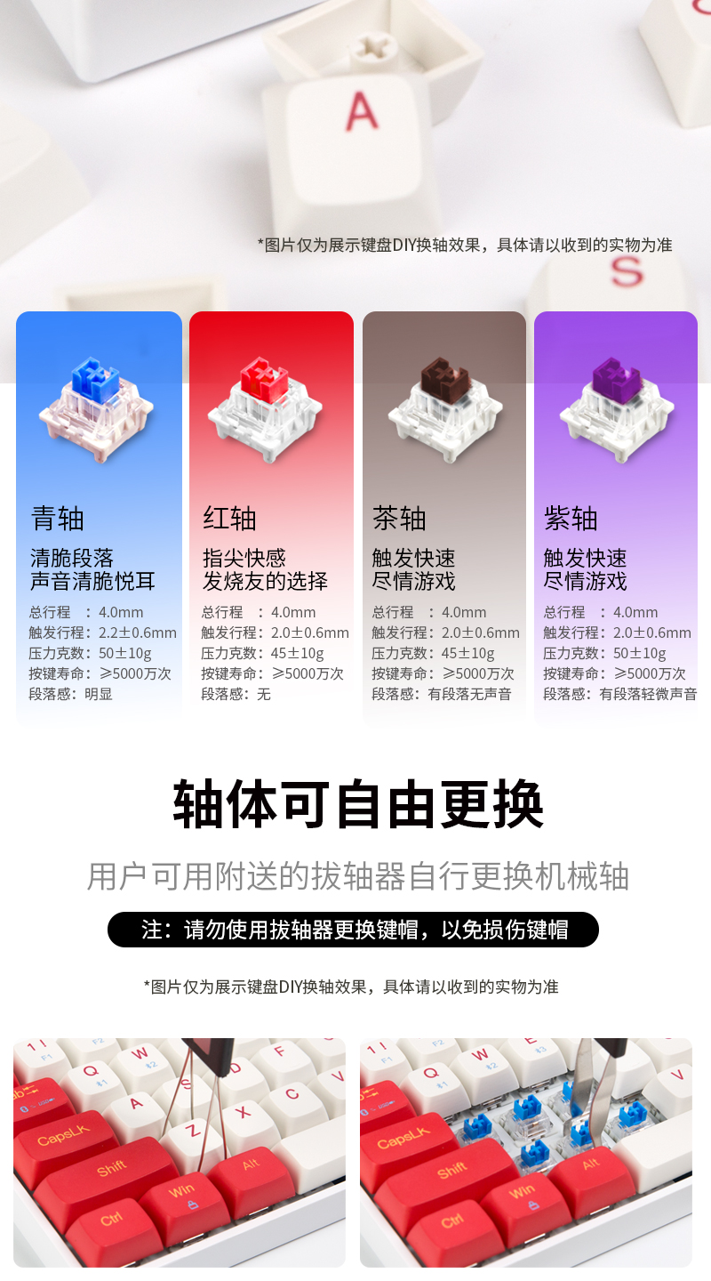 用户可用赠送的拔轴器,自行更换机械轴。